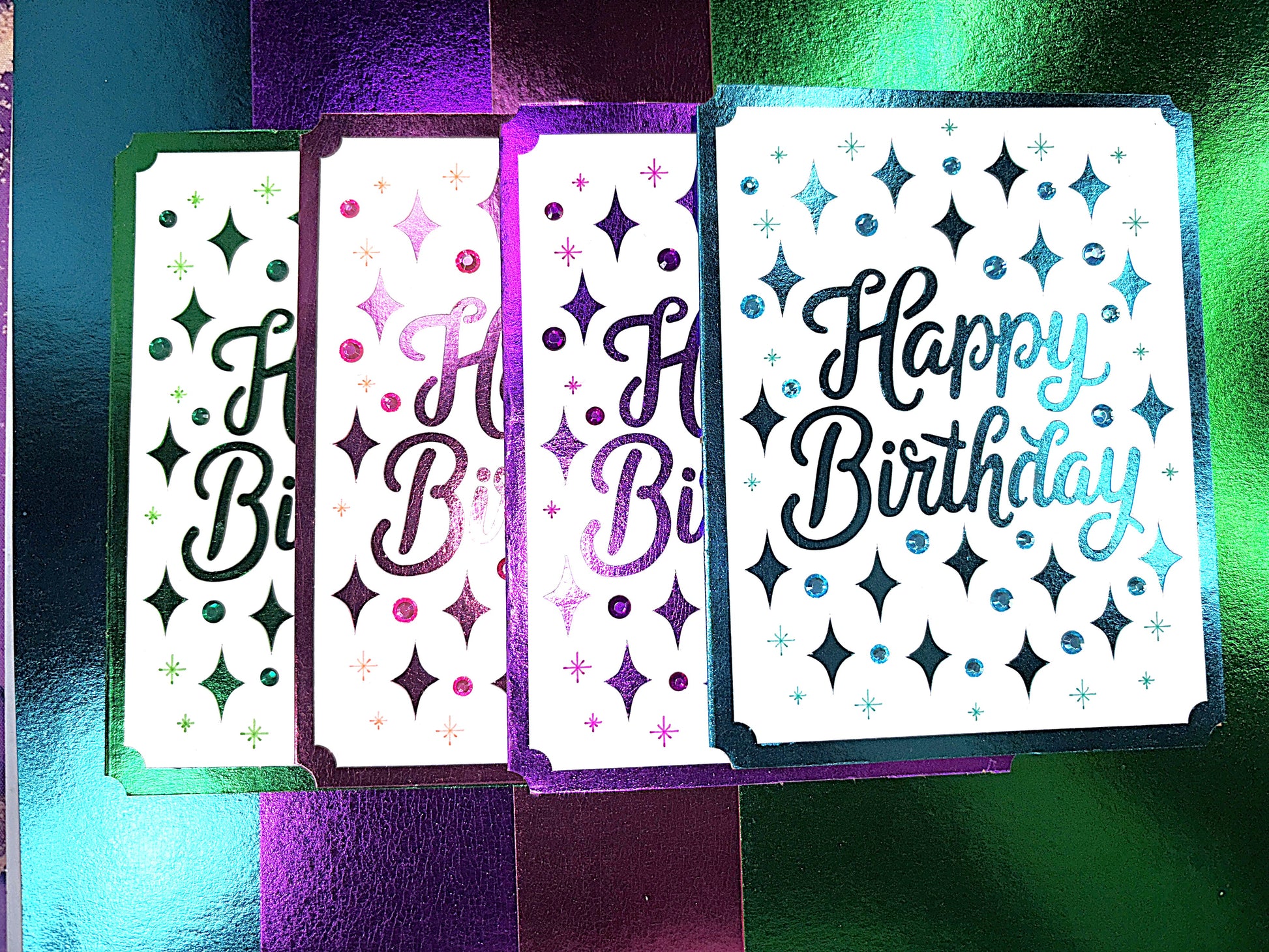 Make birthdays extra special with these stunning birthday cards featuring metallic purple, blue, green and pink foil accents and sparkling rhinestone embellishments.