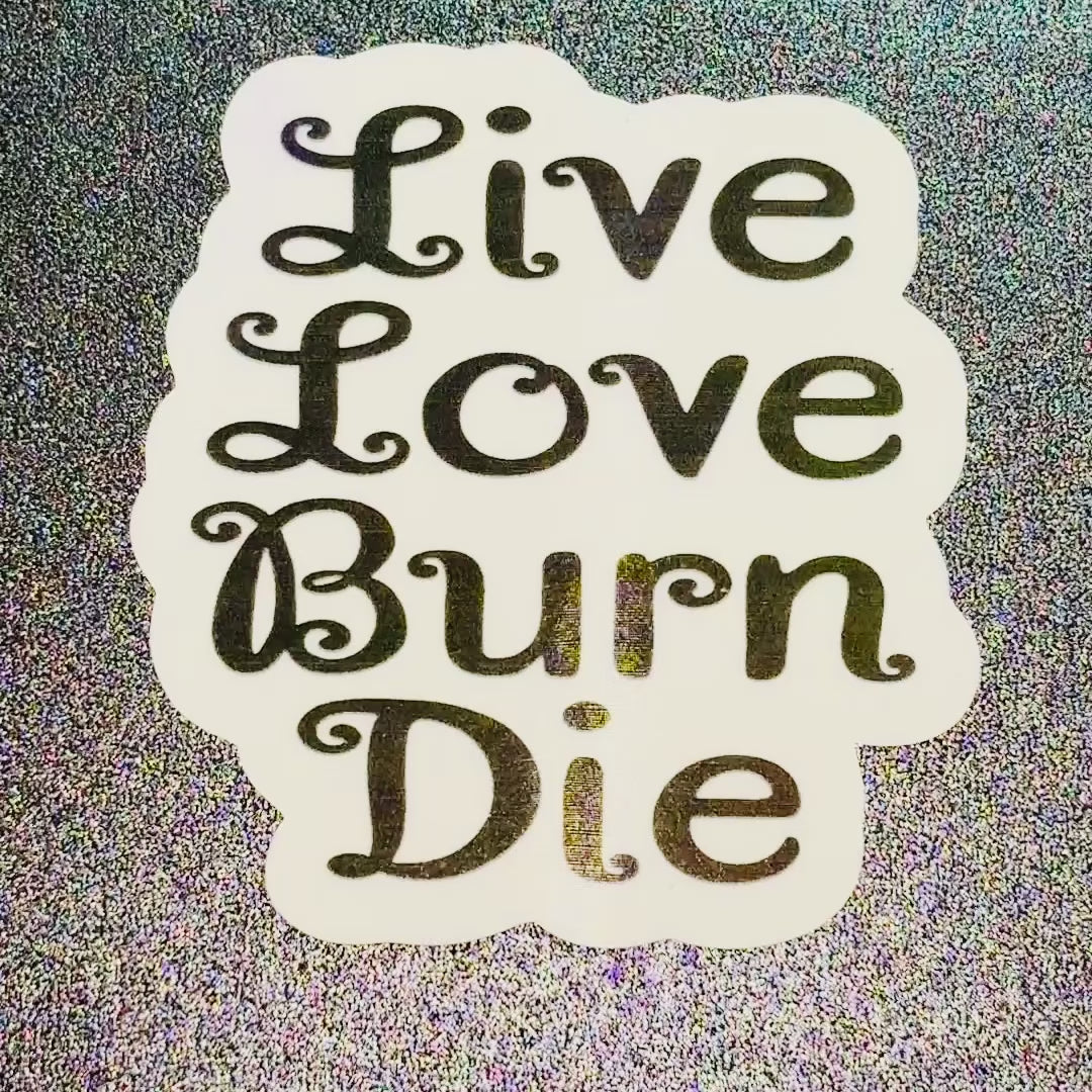 Add some sass to your belongings with our Live Love Burn Die sticker.